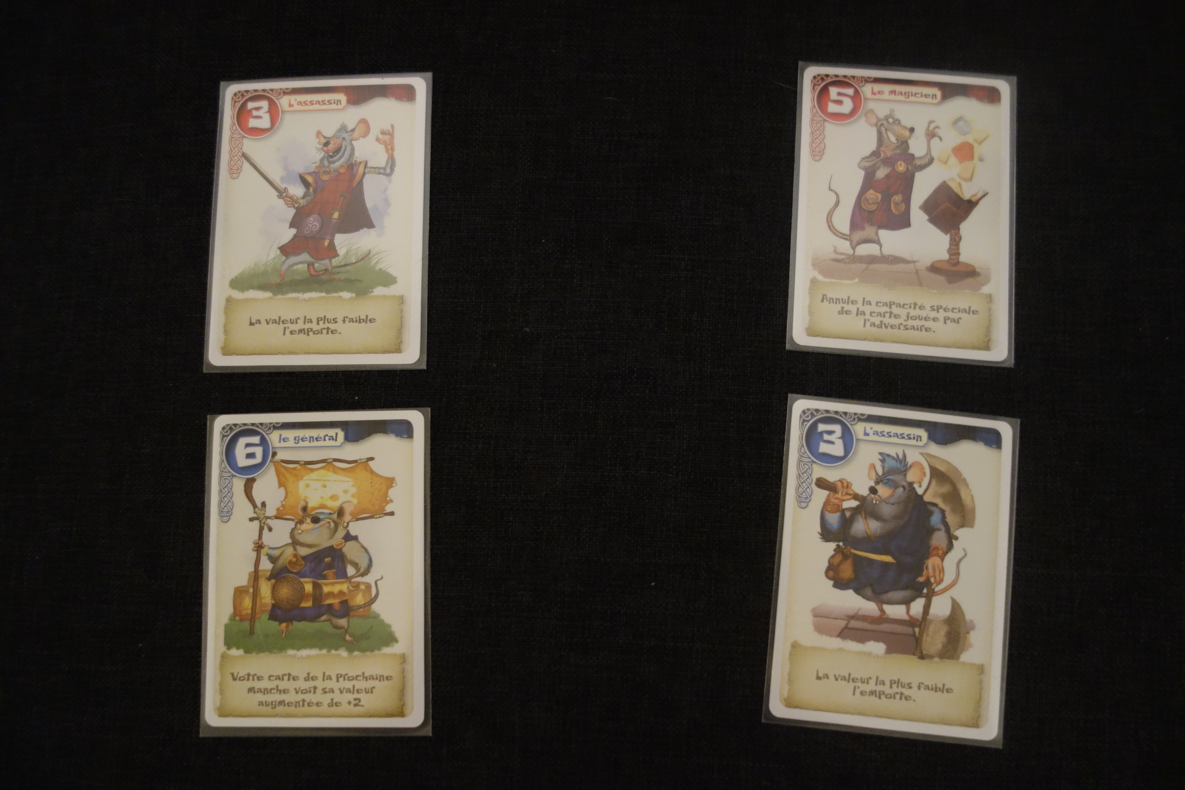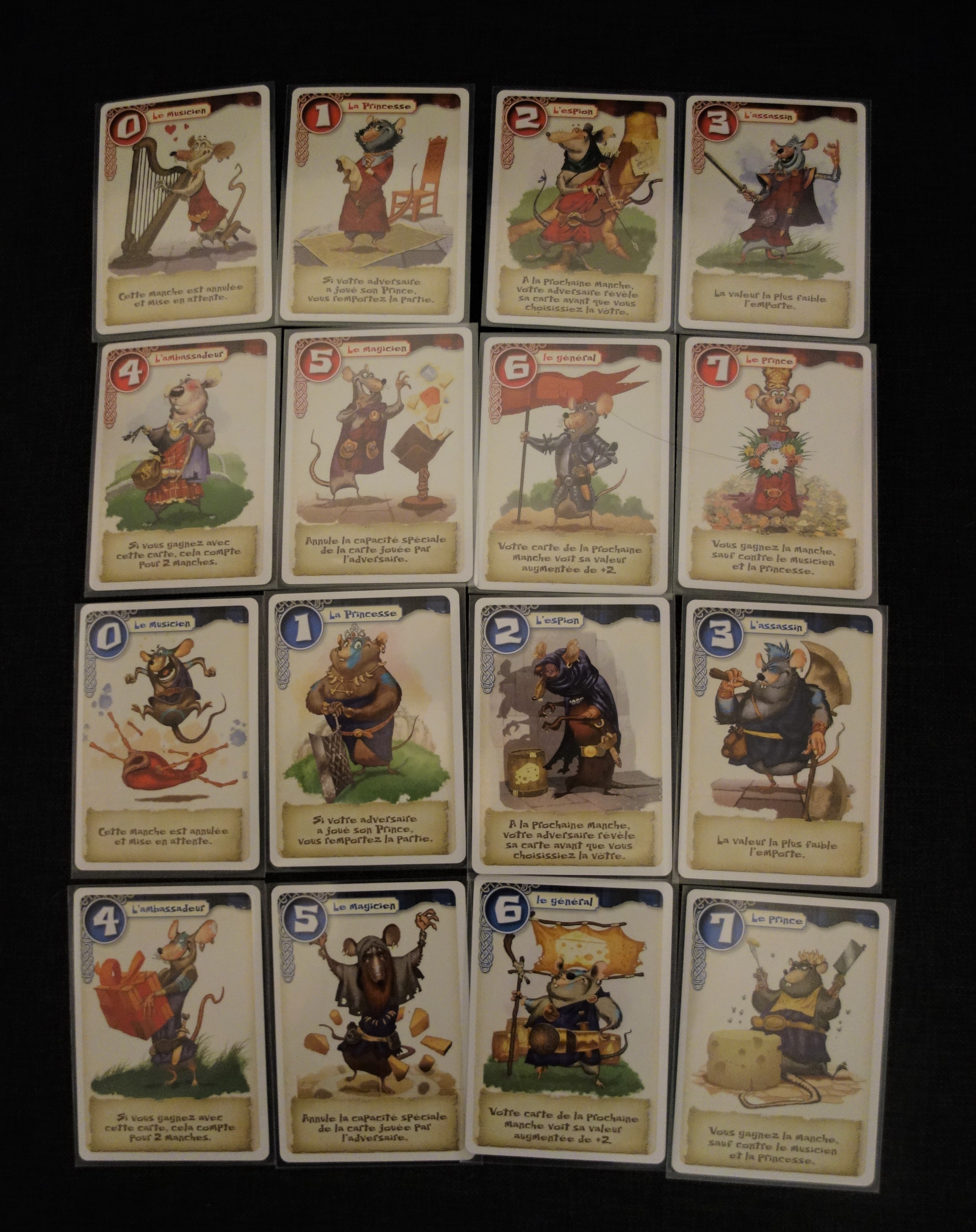 Par exemple, la carte 7- Le Prince, la plus forte du paquet, bat toutes les autres sauf la 0- Le Musicien qui annule la manche en cours, ou bien la 1- La Princesse, la carte la plus facile à battre donc, mais qui en contrepartie permet de remporter instantanément la partie si elle est jouée contre le Prince. Ou bien encore, le 3- L’Assassin est-elle aussi l’une des cartes plutôt faibles, met son effet permet de remporter la manche face à une carte plus forte.
