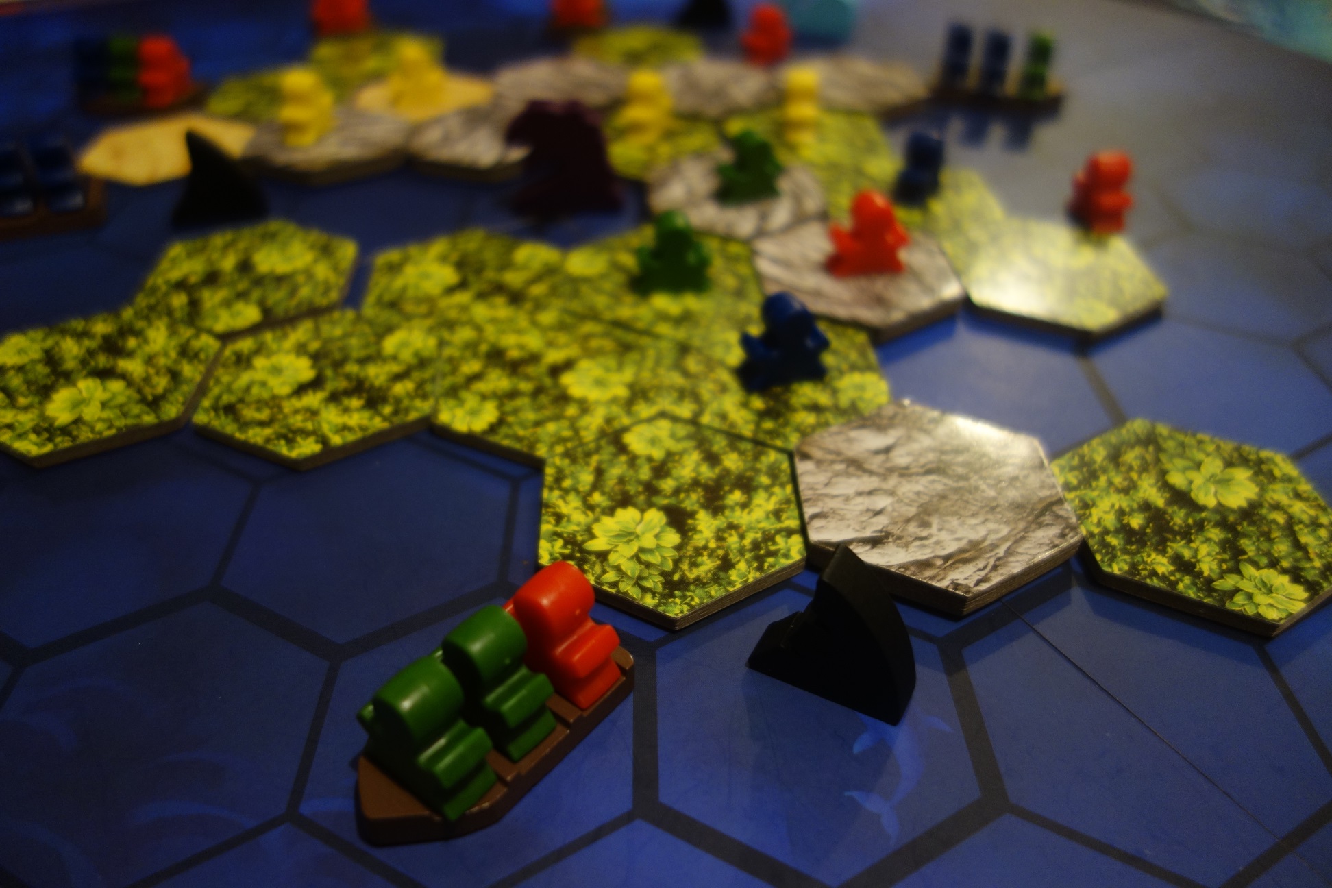 - Le bateau : il ne peut être déplacé par un joueur que s’il est vide ou bien si ce dernier y possède au moins autant d’explorateurs que ses adversaires. Ainsi, chacun peut transporter jusqu’à 3 meeples, peu importe leur couleur. In fine, un bateau peut se déplacer jusqu’à 3 cases, uniquement sur l’eau.