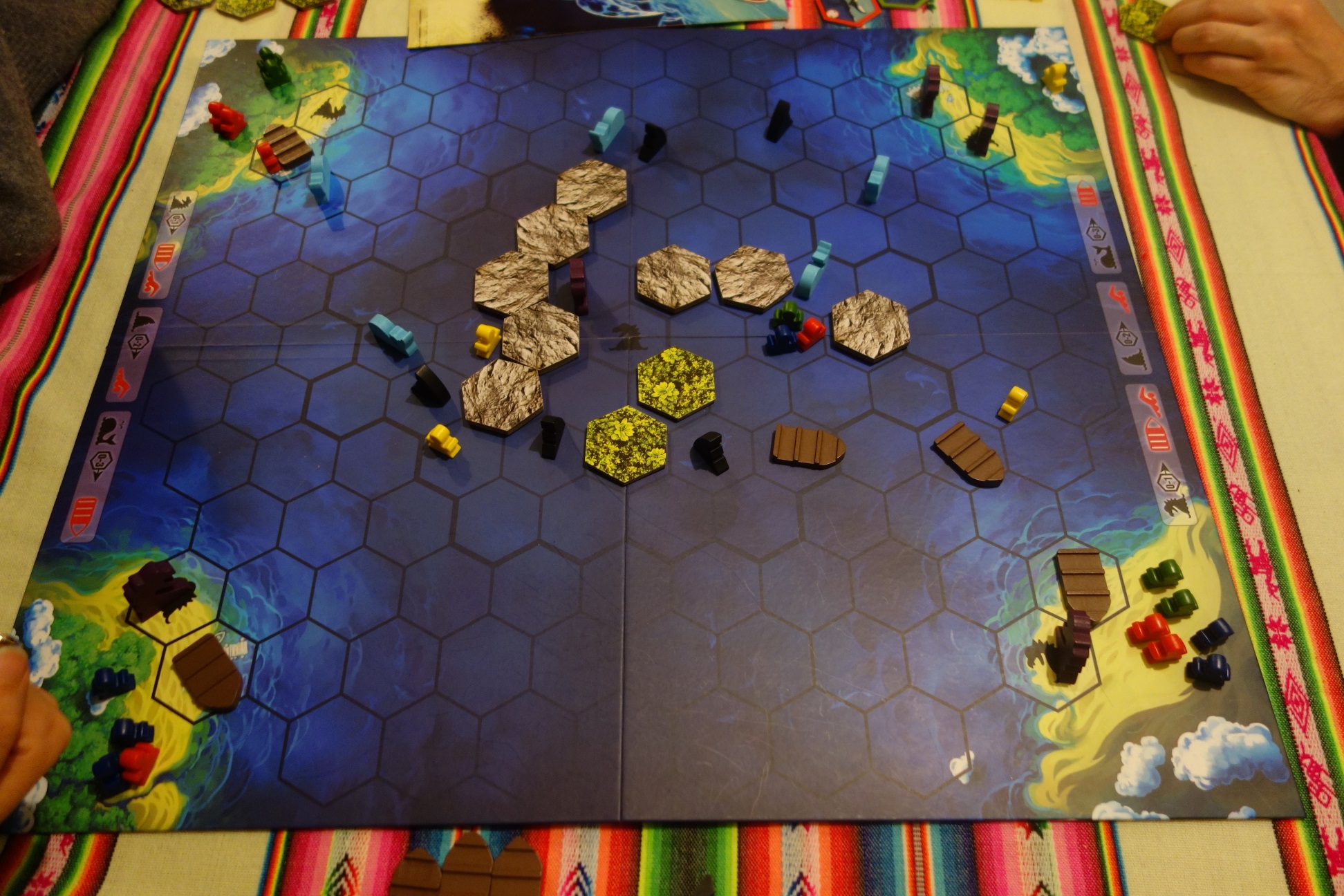 Du côté des tuiles, elles se répartissent en 3 types de paysage : les plages, les forêts et les montagnes, nous y reviendront plus tard. Nous trouvons également sur le plateau de jeu dès sa mise en place 5 serpents de mer : 1 devant chacune des terres situées aux 4 angles, le dernier sur un lac au cœur de l’île. Enfin avant de commencer la partie, les joueurs vont ajouter chacun 2 bateaux sur des cases mer aux abords de l’île.