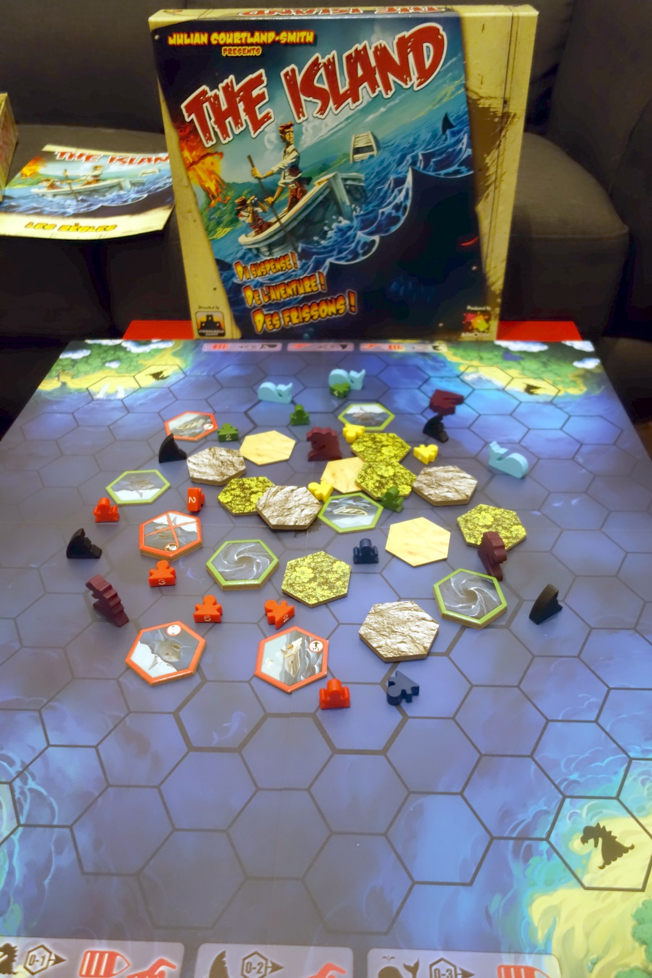 Ainsi, au fil de la partie, les explorateurs vont quitter l’île, de préférence en navire, mais bien plus souvent que l’on voudrait à la nage pour essayer d’atteindre l’un des angles du plateau. Pendant ce temps, l’île s’effondrera, et de plus en plus de dangers seront présents dans les eaux, avec la multiplication des requins et baleines, ou l’apparition des tourbillons, les pires nettoyeurs de l’océan.