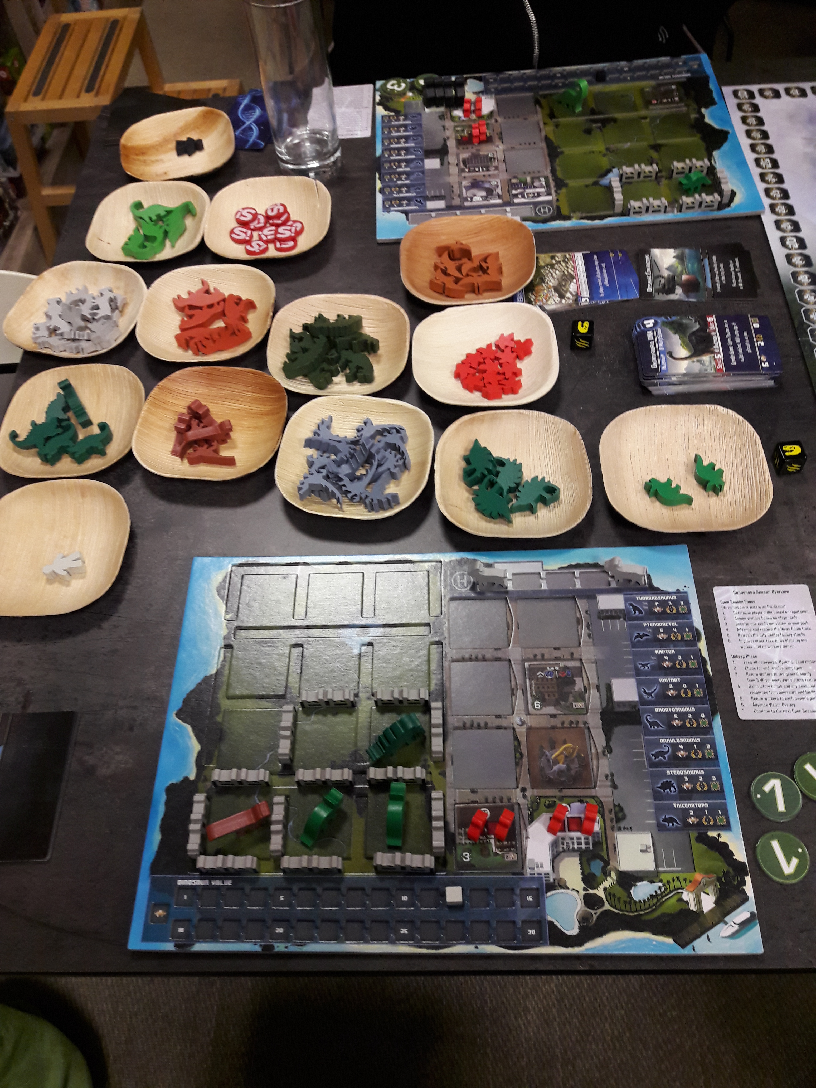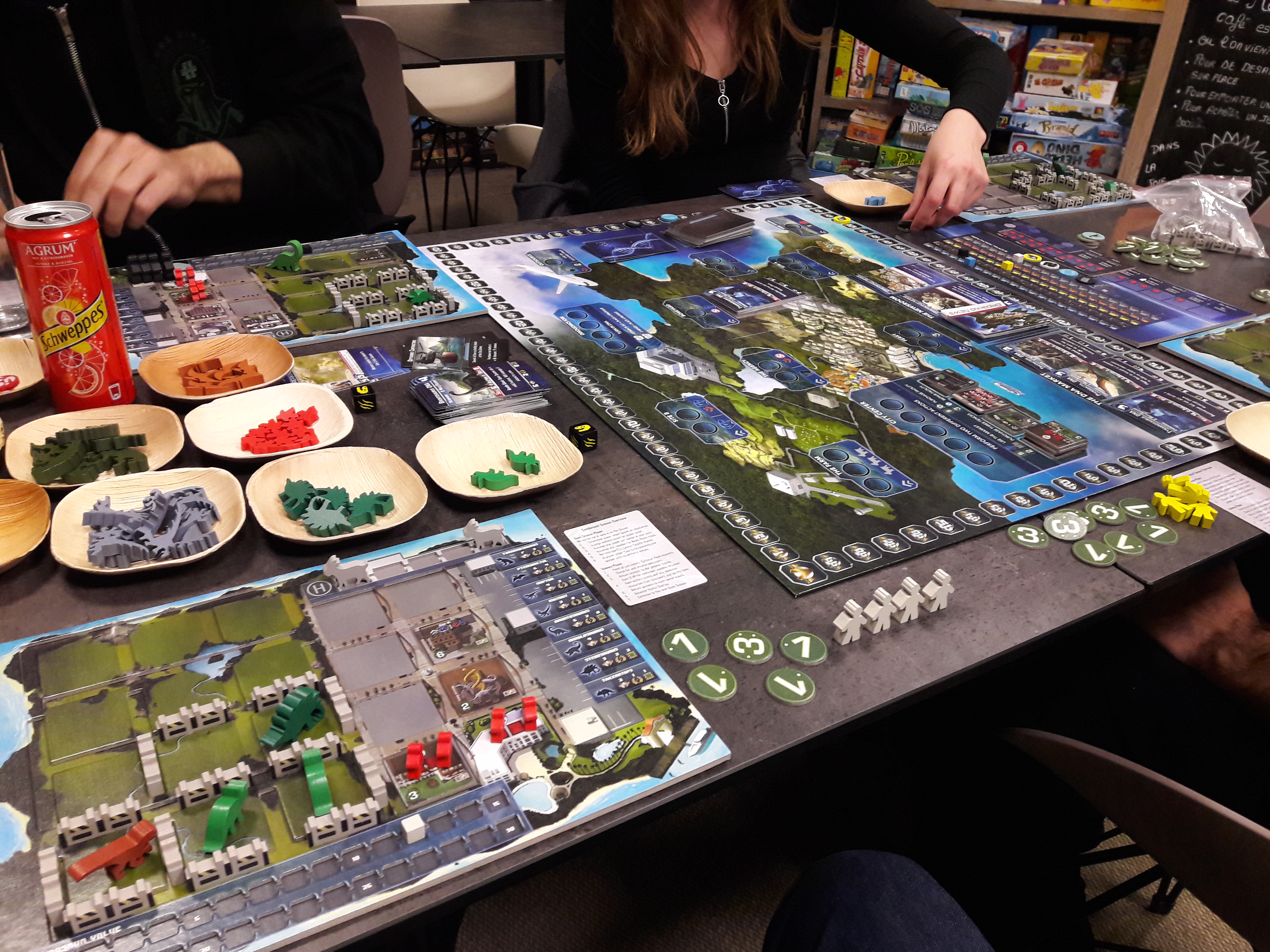 Après avoir terminé cette première partie, je peux le dire : il m’a bien accroché (ainsi que mes camarades de jeu que je salue). Pourtant, au départ, ce n’était pas gagné, puisque nous avons mis un peu de temps à le mettre en place et décortiquer ses règles. Il faut dire que si le matériel du jeu est en anglais, il propose un livret de règle en français en sus de celui dans la langue de Shakespeare. Cependant, au bout d’un petit moment, nous avons été obligé de constater que la traduction française était plutôt perfectible, modifiant souvent le sens du texte initial, le rendant peu compréhensible, ce qui nous a longtemps perdu. Une fois que nous avons basculé sur les règles anglaises, cela allait tout de suite mieux.