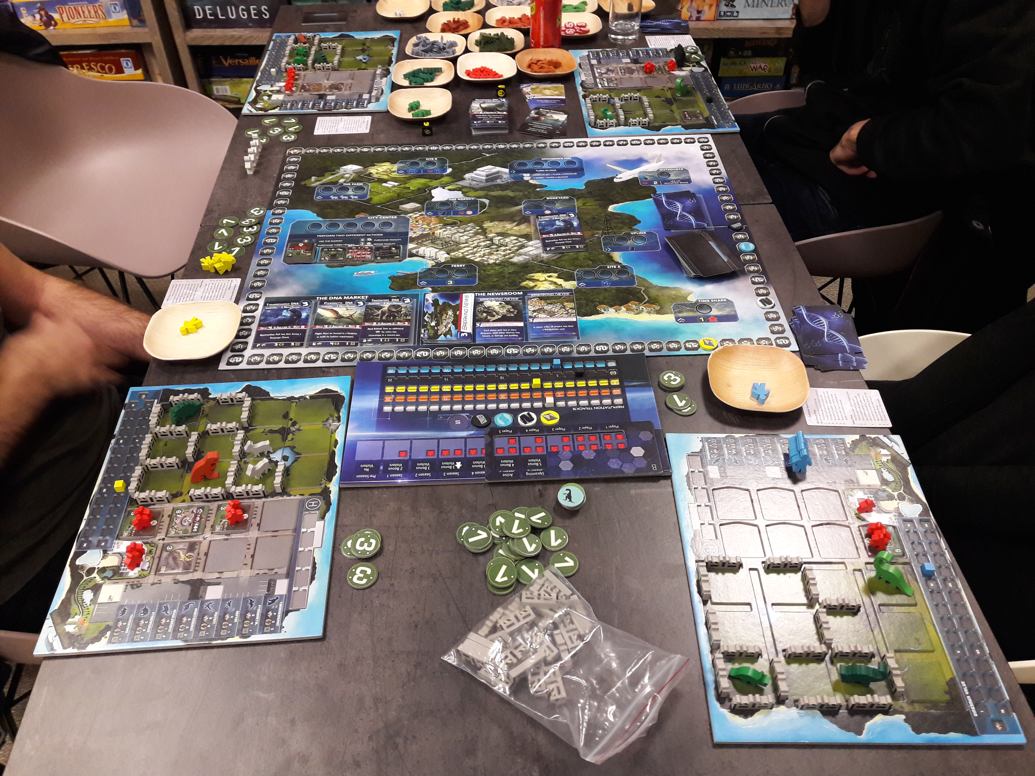 Si vous êtes un(e) lecteure/lectrice habitué(e) de ce blog, vous savez que je suis un fanatique de dinosaures, ainsi que des films Jurassic Park. Je ne pouvais donc pas rester de marbre devant le jeu DinoGenics, issu d’un kickstarter anglophone et dont les boîtes ont été livrées aux backers français il y a quelques jours. En ce qui me concerne, je n’ai jamais participé à un financement participatif, mes finances et mon manque de patience ne me le permettant guère. Toutefois, le bar à jeu parisien Meeple Café, situé dans le 15e arrondissement, avait fait savoir sur les réseaux sociaux cette semaine que le fameux jeu était disponible chez eux. Je me suis donc empressé de recruter trois amis pour aller l’essayer, ce que nous avons fait ce soir.