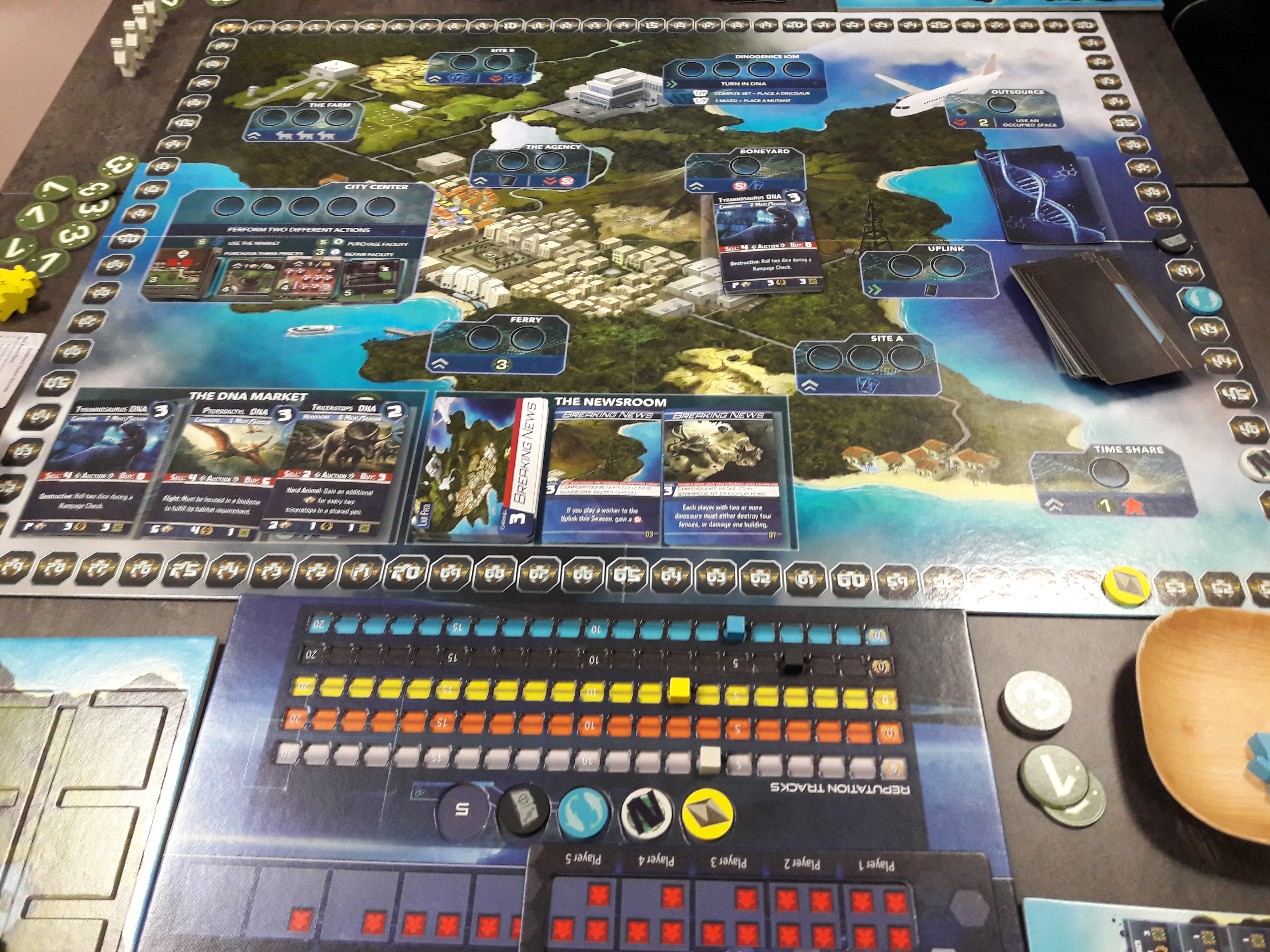Je ne vais pas présenter toutes les règles du jeu, mais en brosser les grandes lignes : une partie se joue en 7 saisons (7 manches), chacune se découpant en 2 parties. Dans la première, nous mettons en place les éléments de la saison en cours, en veillant notamment à actualiser l’ordre des joueurs en fonction de la popularité des parcs, ce qui va avoir une influence sur le nombre de visiteurs se rendant dans les hôtels de chaque île. Puis arrive la phase de placement d’ouvriers proprement dite, celle qui constitue le cœur actif du jeu. C’est là qu’à tour de rôle, chacun pourra effectuer ses actions en posant un de ses ouvriers sur une case vide d’un des différents lieux du plateau central. Ainsi allons nous pouvoir récupérer des cartes d’ADN de dinosaures, ajouter des barrières afin de créer des enclos, construire des installations dans le parc procurant différents effets bonus, ou bien sûr ajouter de nouveaux dinosaures une fois le nombre de cartes ADN requises atteint. Après que tous les ouvriers ont été placés, arrive alors l’intersaison, où les joueurs vont collecter des points de victoire en fonction du nombre de visiteurs présents dans le parc, ainsi que la présence des dinosaures.