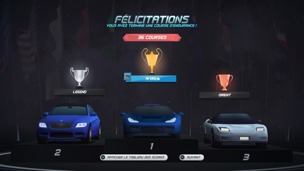 Laissez-moi maintenant vous parler du mode qui m’occupe actuellement : l’endurance. Celui-ci mettra vos nerfs à rude épreuve. Ici, vous allez devoir enchaîner 12, 36 voire les 109 courses, dans l’ultime défi. Comme dans le Tour du monde, vous débloquerez au fur et à mesure les pièces de véhicule, afin d’améliorer vos performances et garder le rythme avec vos compétiteurs. Et il faudra bien le tenir : pour pouvoir passer à la course suivante, il faudra impérativement être placé dans les 5 premiers. Ici, plus que jamais, la bonne gestion des statistiques de votre véhicule est primordiale : que vous soyez en panne d’essence, ou bien que votre vitesse max ne soit pas suffisamment bonne pour vous placer dans les premières places, et tout est à recommencer depuis le début. Fort heureusement, il est possible d’interrompre le mode afin de le reprendre plus tard.