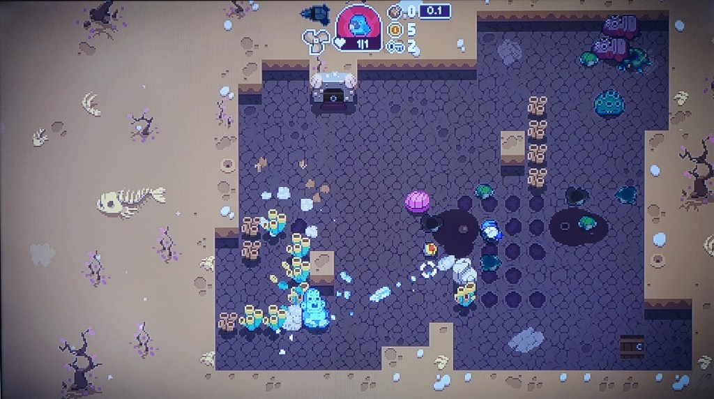 Toujours dans cette idée de simplicité, chaque salle est entièrement contenue sur un même écran fixe, ce qui permet de toujours savoir ce qui nous attend. Pour briser la monotonie toutefois, leurs dispositions sont variées, bien que conservant toujours un aspect parfaitement anguleux. Une fois une salle vidée, une ou plusieurs portes s’ouvrent afin d’aller plus loin dans le monde. Généralement, il s’agira simplement de passer à la salle ennemie suivante. Mais on pourra aussi accéder au marchand, à la salle du boss ou bien à certaines salles verrouillées et autres cachées, proposant de petits défis avec récompense à la clé.