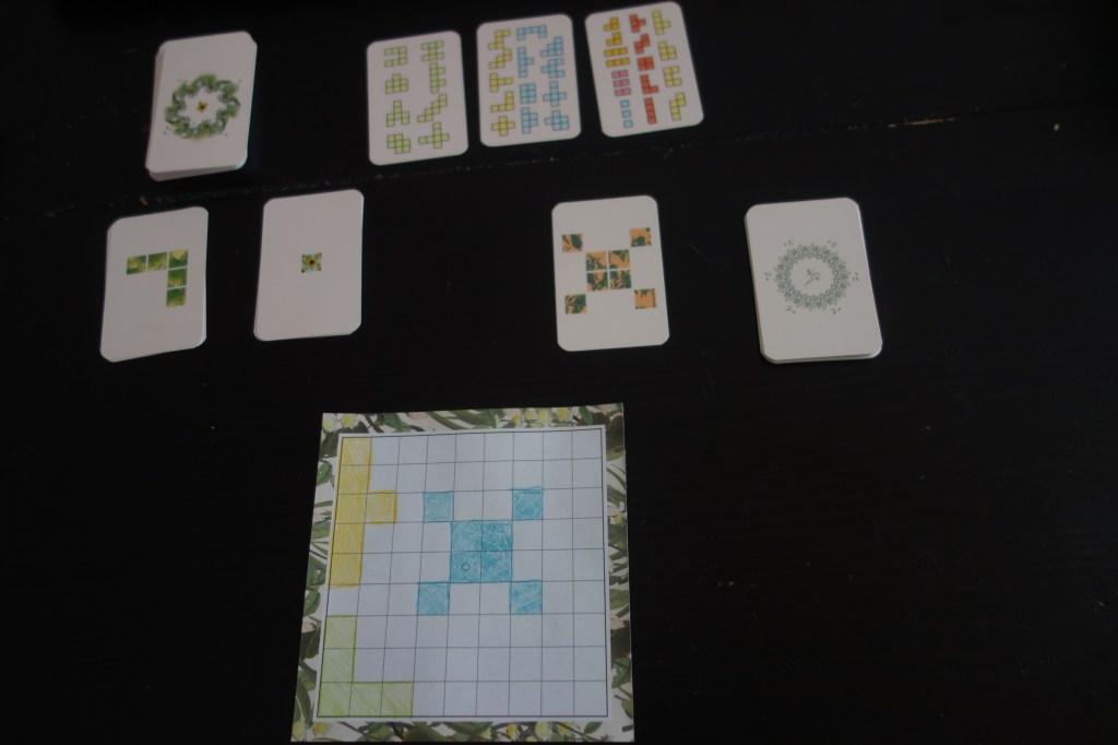 La mise en place d’une partie se fera très simplement : chaque joueur se voit attribué au hasard une Forme de départ qu’il doit reproduire sur sa grille, de sorte que celle-ci se superpose à la case centrale de sa grille. Il est possible, et ce tout au long de la partie, de retourner ou pivoter la forme pour pouvoir la placer. Une fois fait, les tours s’enchaînent de la sorte : deux cartes de la pile Forme sont retournées. Comme mentionné plus haut, celles-ci sont constituées de 1 à 7 carrées, selon de nombreuses configurations possibles (toutes rappelées sur les cartes Formes disponibles). Chaque joueur doit alors choisir celle qu’il souhaite reproduire librement sur sa grille. Aux simples conditions que celle-ci n’en dépasse pas, ni ne se superpose à une forme déjà présente.