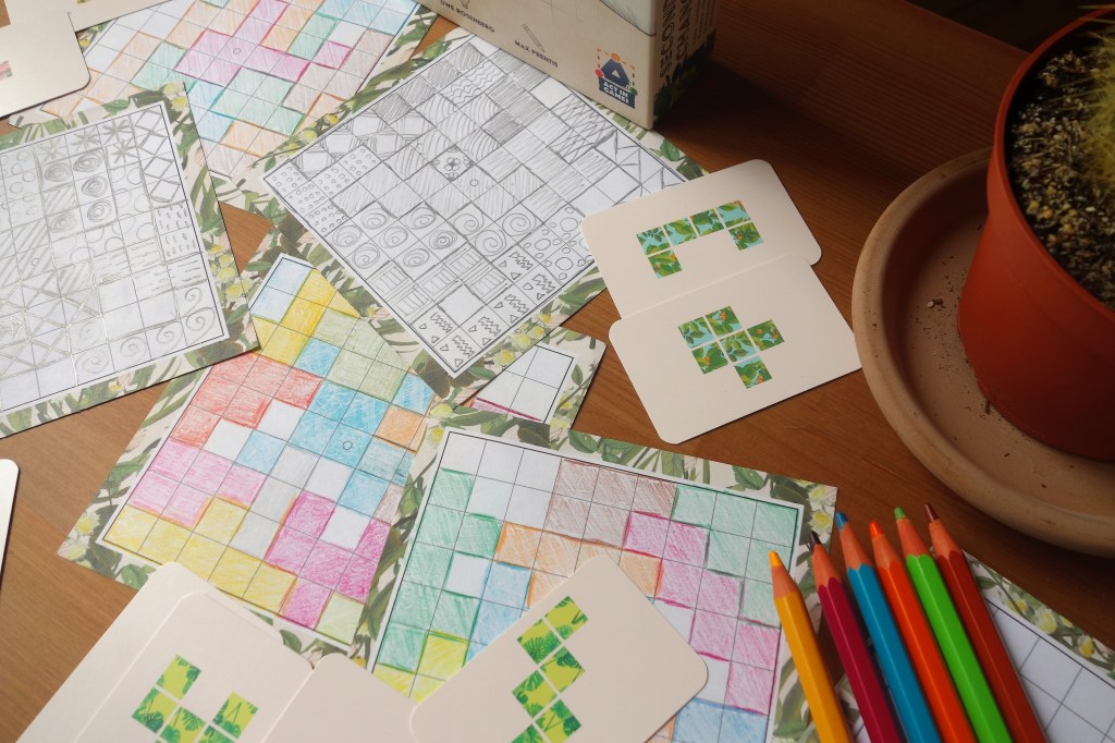 Car c’est bien sur cet aspect que se situe, à mes yeux, le principal intérêt du titre. S’il reste un jeu aux règles simples, il est également une activité créative, sans pression aucune. Cela se perçoit manifestement dans l’esthétique de son matériel : quel lien entre le propos du jeu et le choix de représenter toutes ces plantes sur le dos des cartes, le contour des grilles ou bien la boîte ? Thématiquement, ludiquement, cela n’a aucun sens. En revanche, impossible de ne pas faire le rapprochement avec l’esthétique propre aux carnets de coloriages et de détentes pour adulte. C’est exactement la raison pour laquelle j’aime sortir de temps en temps la boîte pour colorier une grille. Évidemment, je ferai en sorte de tenir le plus longtemps possible avant de me retrouver bloqué, je reste un joueur. Mais mon principal plaisir reste celui de colorier tranquillement les cases, voir les motifs se combiner sur la feuille, et essayer de les ranger tranquillement. Un véritable moment de zen et de détente pour moi.