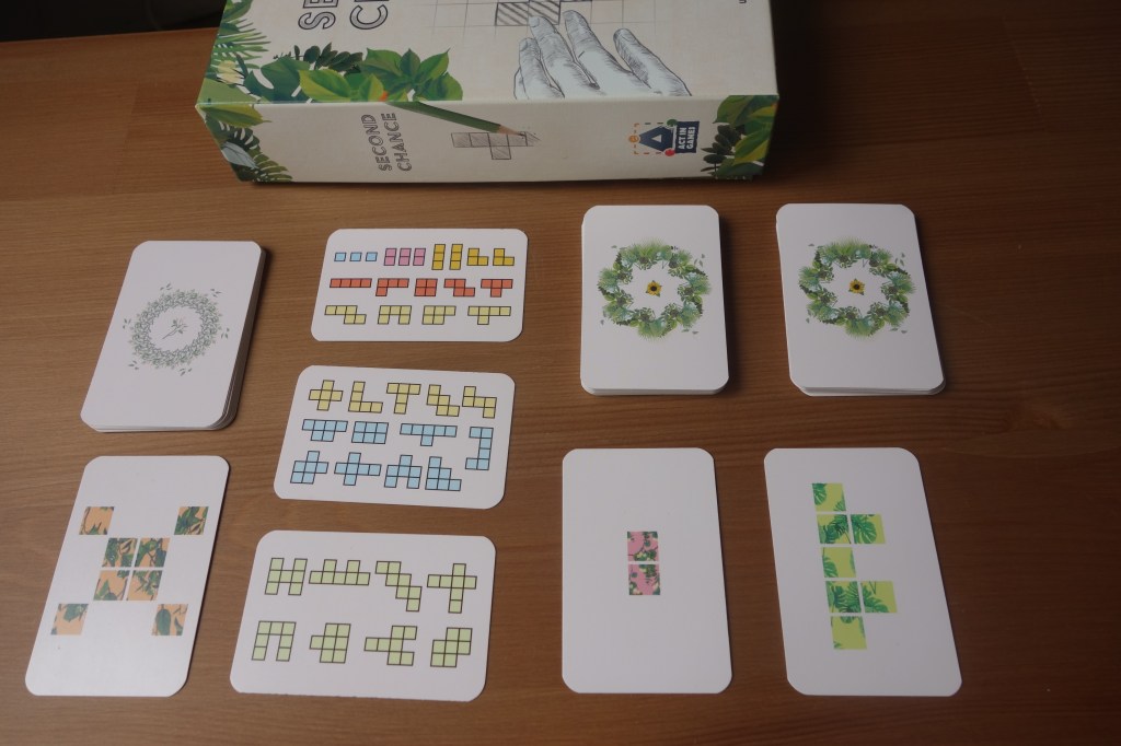 Tout cela est bel et bon, mais pourquoi donc ce titre énigmatique, Second Chance ? Quel rapport avec nos grilles ? J’y viens ! À force de remplir ces dernières, finira fatalement par arriver le moment où aucune des deux cartes tirées pour le tour ne permettra à un joueur d’adjoindre à sa feuille une de celles-ci, le menant logiquement à la fin de sa partie. Mais peut-être pas tout à fait, car il peut alors s’en remettre à sa Seconde Chance : il pioche une troisième forme qu’il sera la seule personne de la table à pouvoir exploiter. Si cette dernière entre dans la grille, le joueur est toujours en jeu. Si ce n’est pas le cas, sa partie s’arrête. Le premier éliminé a cependant le droit à un bonus : il peut marquer un des carrés disponibles par un 1, ce qui procure un double avantage : griser une case de plus, et lui permettre de remporter la victoire en cas d’égalité finale.