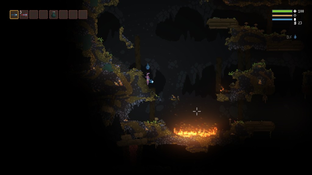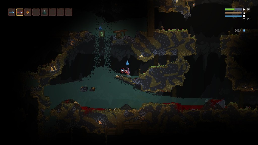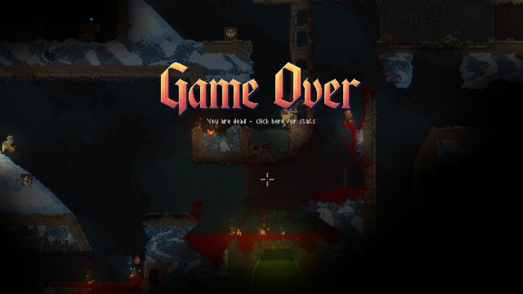 Mais le plus grand souci actuel, en ce qui me concerne, est la très mauvaise optimisation du titre, rendant sa jouabilité rapidement compliquée. En se reposant sur un système où chaque pixel est géré séparément, le jeu fait appel à un moteur physique lourd, tout en s’appuyant constamment sur de très nombreux effets de particule. Pour pouvoir faire tourner tout cela correctement, il exige donc, malgré ses graphismes en pixel art, une configuration relativement musclée. Et à l’heure actuelle, les options graphiques ne permettent pas d’y changer grand-chose. Sur mon ordinateur portable vieillissant, le titre se met rapidement à ramer, dès que les ennemis et les effets commencent à être trop nombreux à l’écran. Si bien qu’au fur et à mesure de la progression, il me devient de plus en plus difficile d’y jouer dans de bonnes conditions. Difficile d’en cette situation de survivre. Heureusement, on peut rester optimiste sur ces deux sujets : le jeu est actuellement toujours en accès anticipé. Aussi peut-on espérer qu’au fil des mises à jour, des améliorations soient apportées en termes de confort de jeu, et d’optimisation. Affaire à suivre.