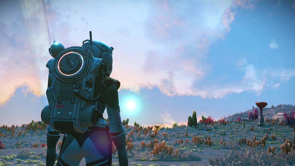 À la sortie, point de multijoueur, l’aspect solitaire étant largement mis en avant dans la prémisse scénaristique même. Pourtant, dès la parution de No Man’s Sky, les bases de ce grand jeu procédural d’aventure spatiale étaient déjà bien présentes, derrière ses nombreux défauts. La jouabilité était répétitive et limitée sur le plan de la narration. Côté graphismes, le résultat était loin d’être mirifique sur PlayStation 4 slim : la distance d’affichage était réduite et de nombreuses textures assez pauvres. Néanmoins, la sensation de liberté propre à No Man’s Sky était déjà présente. Il était déjà grisant de se déplacer en temps réel d’une planète à une autre d’un bout à l’autre d’un système solaire grâce à son vaisseau et s’étourdir face à l’immensité de chaque astre. Ainsi pouvait-on fouiller plus ou moins (plutôt moins que plus face à l’ampleur de la tâche) intégralement un système avant de passer à un suivant d’un simple hypersaut spatial, avec comme objectif alors de peut-être rejoindre le centre de l’univers. Bonne chance pour cela, car ici, comme en dehors du jeu, l’univers est vaste : 255 galaxies pour 2,2 billions de systèmes stellaires, chacun composé d’un petit nombre de planètes et lunes. Autrement dit, le travail collectif de l’ensemble des millions de joueurs de No Man’s Sky ne leur permettra jamais de découvrir l’ensemble de ces astres, tant ces chiffres sont étourdissants. Je trouve une certaine poésie à cela : était-ce utile d’offrir un terrain de jeu aussi vaste ? Probablement pas, mais No Man’s Sky touche ici du doigt l’immensité de l’univers réel, et je trouve cela beau.