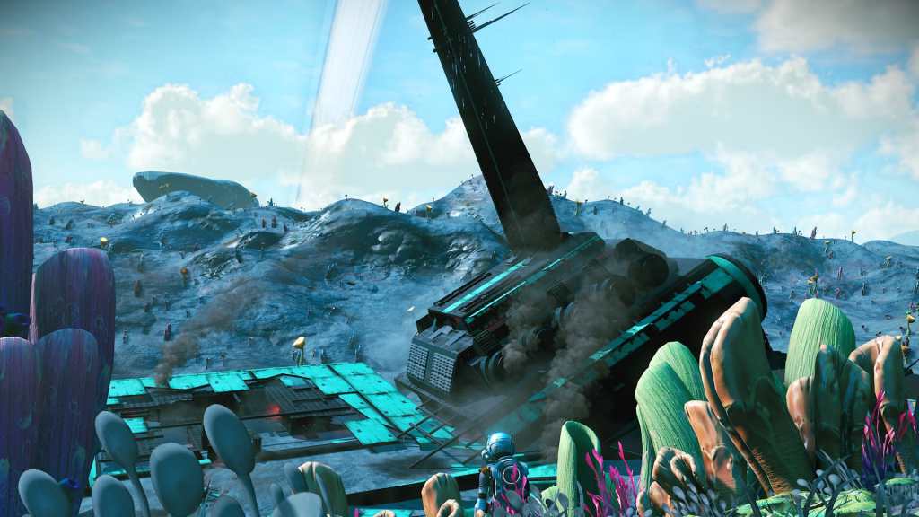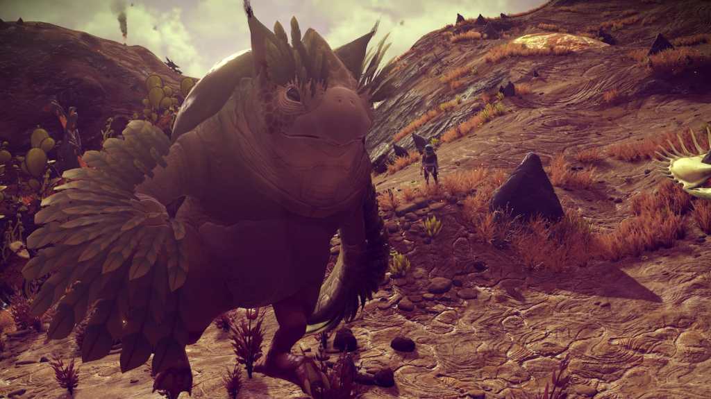 Je suis donc reparti de zéro dans les cieux et sur les terres de No Man’s Sky, et l’expérience m’a vraiment happée cette fois. Commençons par le plus évident : tout en étant largement procédural, le jeu est à présent magnifique, d’autant plus que les développeurs ont fait le choix de remplacer la vue initiale à la première personne par une vue à la troisième personne par défaut. Combien de fois me suis-je arrêté pour profiter du panorama et du tableau qui s’offrait à moi ? Les captures d’écran fusent. Si le fond reste le même, se reposant massivement sur le crafting, mon regard a changé rapidement sur le jeu, afin de se calibrer sur mon aspiration initiale : No Man’s Sky est un jeu contemplatif, il ne vous presse pas, il se savoure à travers ses paysages et ses découvertes. Bien sûr, il s’agit toujours de ramasser constamment des ressources, nécessaires pour pouvoir se déplacer / progresser facilement dans les trames scénaristiques. Mais ce n’est pas grave, car, pour les esprits curieux, le titre offre toujours un nouveau point d’intérêt pour garder la curiosité en éveil. Le jeu finira par me lasser, c’est certain. Pourtant, il est parvenu à trouver ce subtil équilibre entre être toujours pareil et toujours un peu différent, grâce aux innombrables améliorations, technologies, surprises et découvertes à effectuer. Bien sûr, les biomes ne sont pas infinis, les variétés de faune, flore et minéraux non plus. Mais en huit ans, l’équipe a largement pu les diversifier pour sans cesse vouloir découvrir la suite. Croyez-moi, la découverte d’un vers géant type Shai-Hulud ou d’une créature mi-mammifère/mi-racine est un véritable émerveillement.
