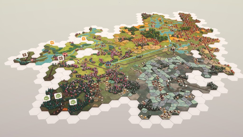 Enfin, comment ne pas évoquer le joli destin de ce qu’il convient désormais d’appeler une licence ? Grâce à son succès, le petit jeu vidéo indépendant a fini par donner naissance à un jeu de société de placement de tuiles coopératif. Le titre vidéoludique, clairement inspiré des jeux sur table, a ainsi donné naissance à une version physique récompensée du Spiel des Jahres, le plus grand prix ludique en Allemagne. L’aventure ne s’est d’ailleurs pas arrêtée là, puisque après un premier petit frère proposant une confrontation à deux joueurs, Dorfromantik Duel, une troisième version sur table a également vu le jour récemment : Dorfromantik Sakura. Cette dernière apporte un nouveau biome japonisant (aussi présent dans le jeu vidéo), ainsi que des possibilités supplémentaires. In fine, l’adaptation jeu de société est sûrement devenue plus célèbre que son pendant vidéoludique originel ! Pour en revenir à vos écrans, si les jeux vidéo de puzzle chill sont votre genre, ou si vous tirez satisfaction d’un certain sens de l’esthétique, je ne peux que vous inviter à l’essayer, que ce soit sur Windows ou sur Nintendo Switch.