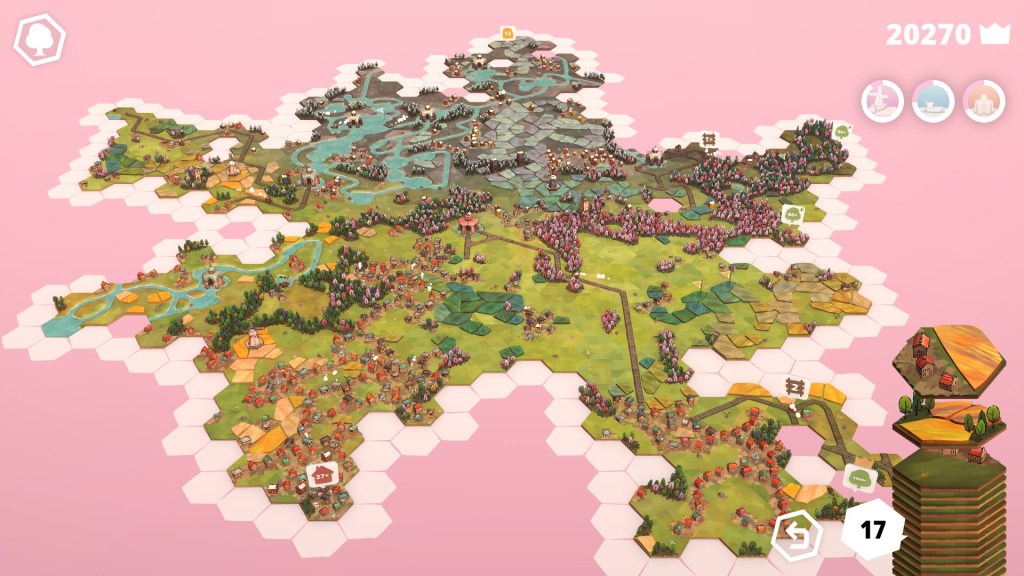 Je ne vous ai d’ailleurs même pas encore parlé des objectifs à longs termes, comme atteindre des scores toujours plus élevés ou réaliser des zones toujours plus grandes, afin de débloquer des déclinaisons de tuiles existantes ou des nouveaux biomes. Encore dans cette idée d’inciter le joueur à jouer sur la durée, des tuiles grisées apparaîtront un peu à l’écart de votre paysage. Si vous parvenez à les connecter correctement et remplir l’objectif (souvent exigeant) qu’elles vous demandent, vous obtiendrez alors une nouvelle variante de tuile pour vos prochaines parties. Ces variantes ajoutent par exemple des animaux comme des castors sur les rivières ou des sangliers dans la forêt.