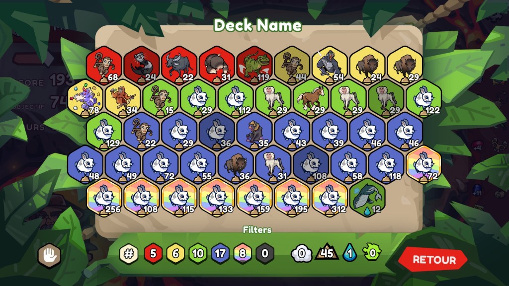 Reprenons les bases : l’enjeu est donc de poser des tuiles hexagonales Animaux sur les cases d’un plateau. Pour pouvoir être placée, une tuile doit avoir au moins un critère commun avec toutes celles adjacentes parmi les deux existants : même couleur (au nombre de cinq, plus l’arc-en-ciel qui fait office joker) et le même type (au nombre de trois : eau, ciel et terre). Tout comme Balatro, il sera question, à chaque manche, de dépasser le score exigé, en un nombre de tours limité. Après chaque victoire, vous pourrez obtenir un animal ou un en-cas (bonus à usage unique). De plus, les manches sont divisés en semaine. En milieu de semaines, la boutique permet d’acheter, grâce à l’argent collecté au fil des manches, de nouveaux en-cas et souvenirs (des effets permanents) pour spécialiser toujours plus son jeu. Enfin, le dernier jour de chaque semaine, un niveau spécial est proposé, avec de nouvelles contraintes, comme des cases de plateau différentes ou un malus appliqué à vos tuiles.